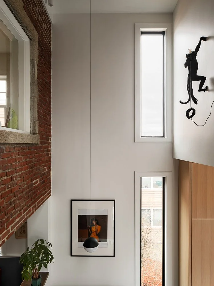 Some additions find the balance between feeling like a part of the existing house and standing apart. The addition flows seamlessly from the existing house, breathing new life into the home. Between the slight angle of the property line and the owners’ desire for higher ceiling heights, this addition flows from the existing house to the new with a double-height space that mediates between the two. The brick of the existing facade is celebrated in the atrium space and sophisticated moments of either subtle details or whimsy are framed by a view through a window or exposed when you turn a corner. For a peak at beautiful sunsets, a small wrap-around deck creates a vista to enjoy a quiet moment of beauty.